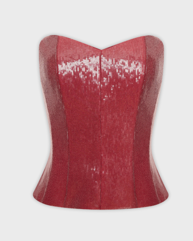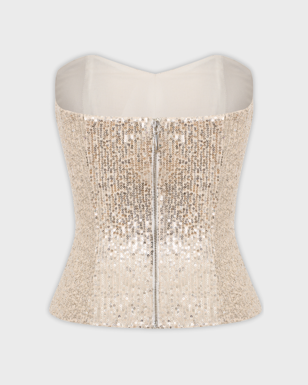 Корсет расшитый мерцающими серебряными пайетками. Создает элегантный силуэт, подчеркивая талию и зону декольте.