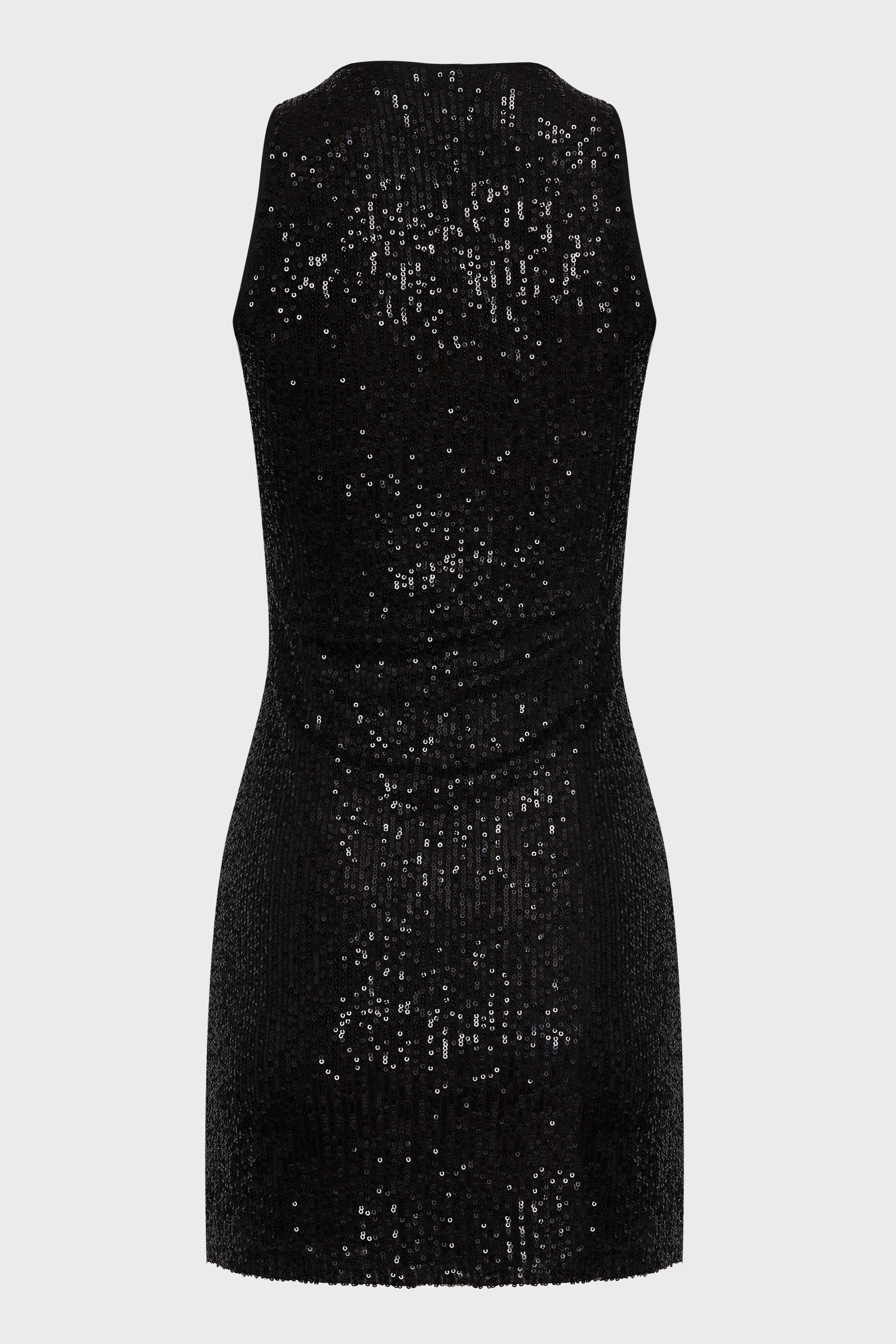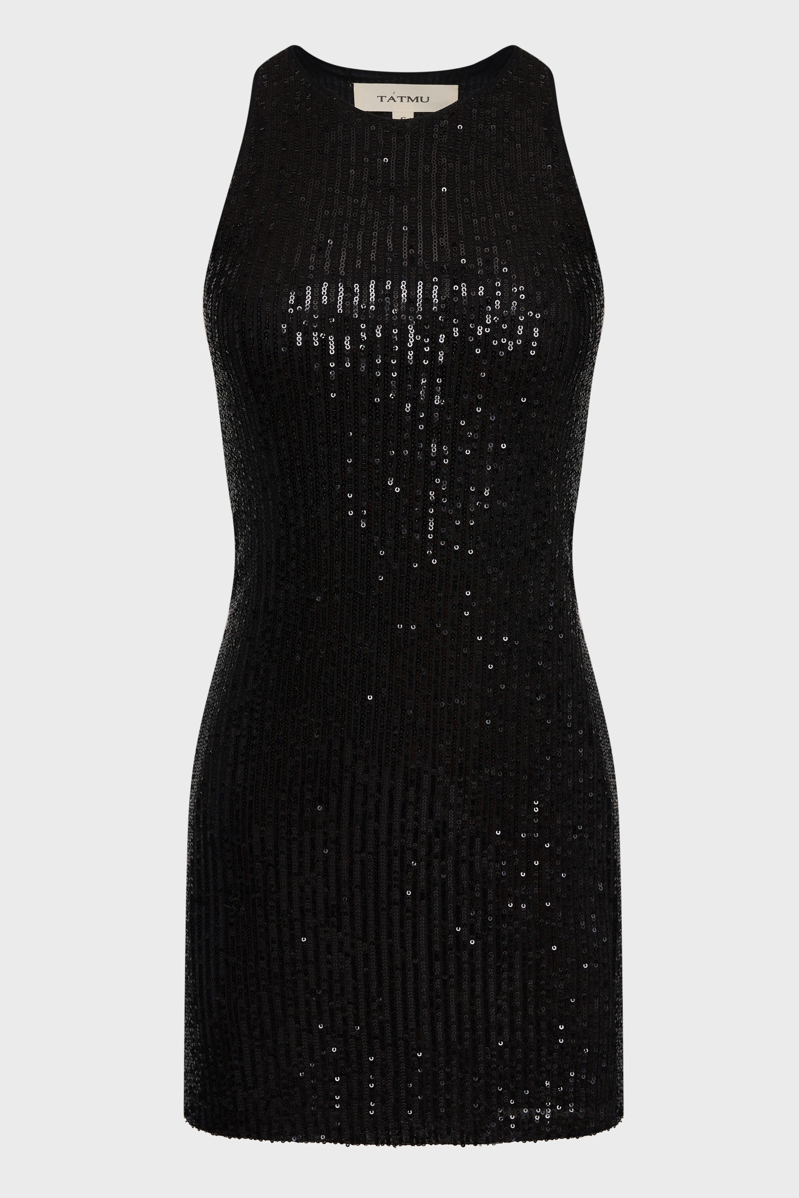 Короткое платье-майка, расшитое черными пайетками, создающими эффект сияния при движении. Лаконичный приталенный крой подчёркивает фигуру, а мягкая эластичная подкладка обеспечивает комфортную посадку. Идеальный выбор для вечерних мероприятий и особых случаев.