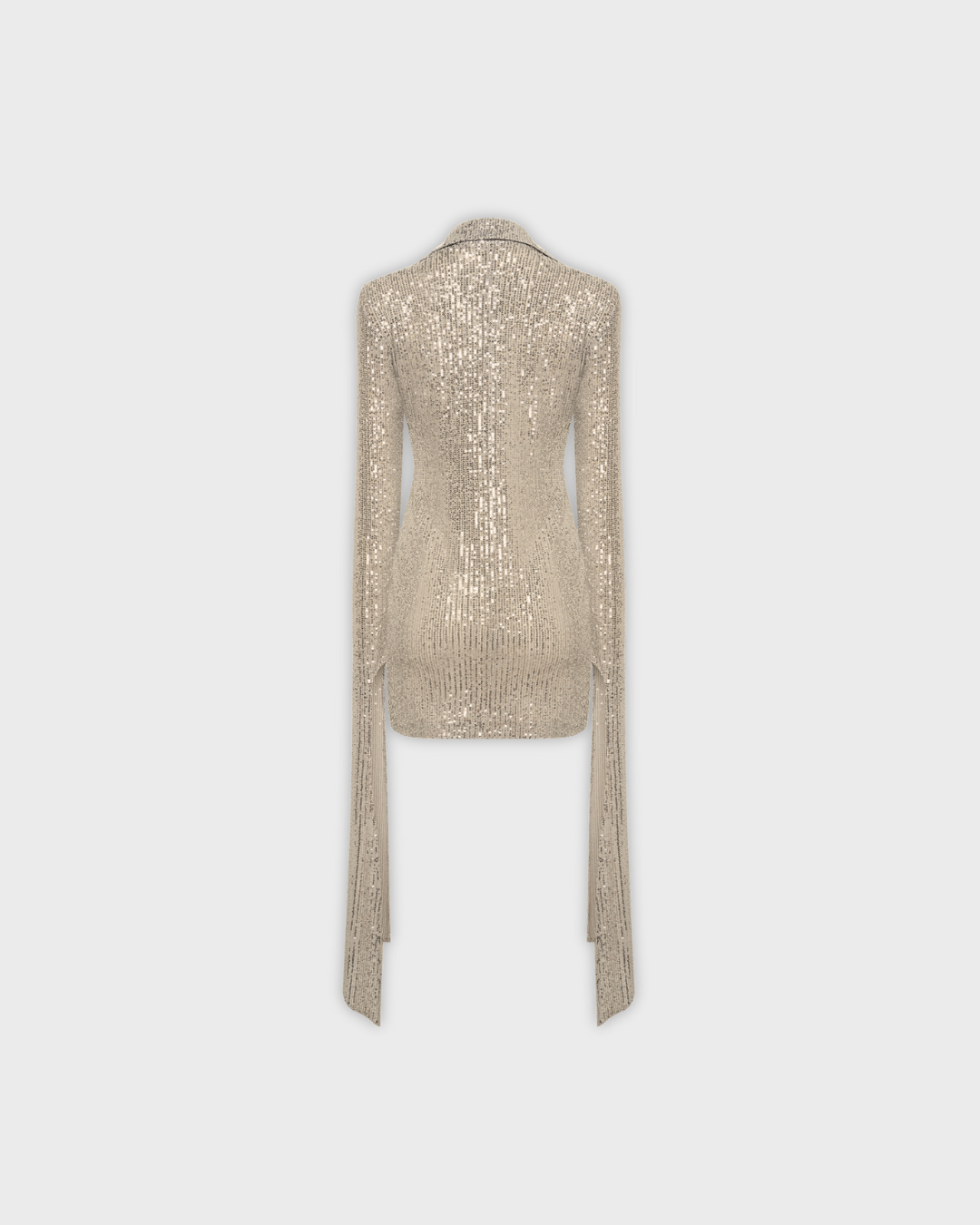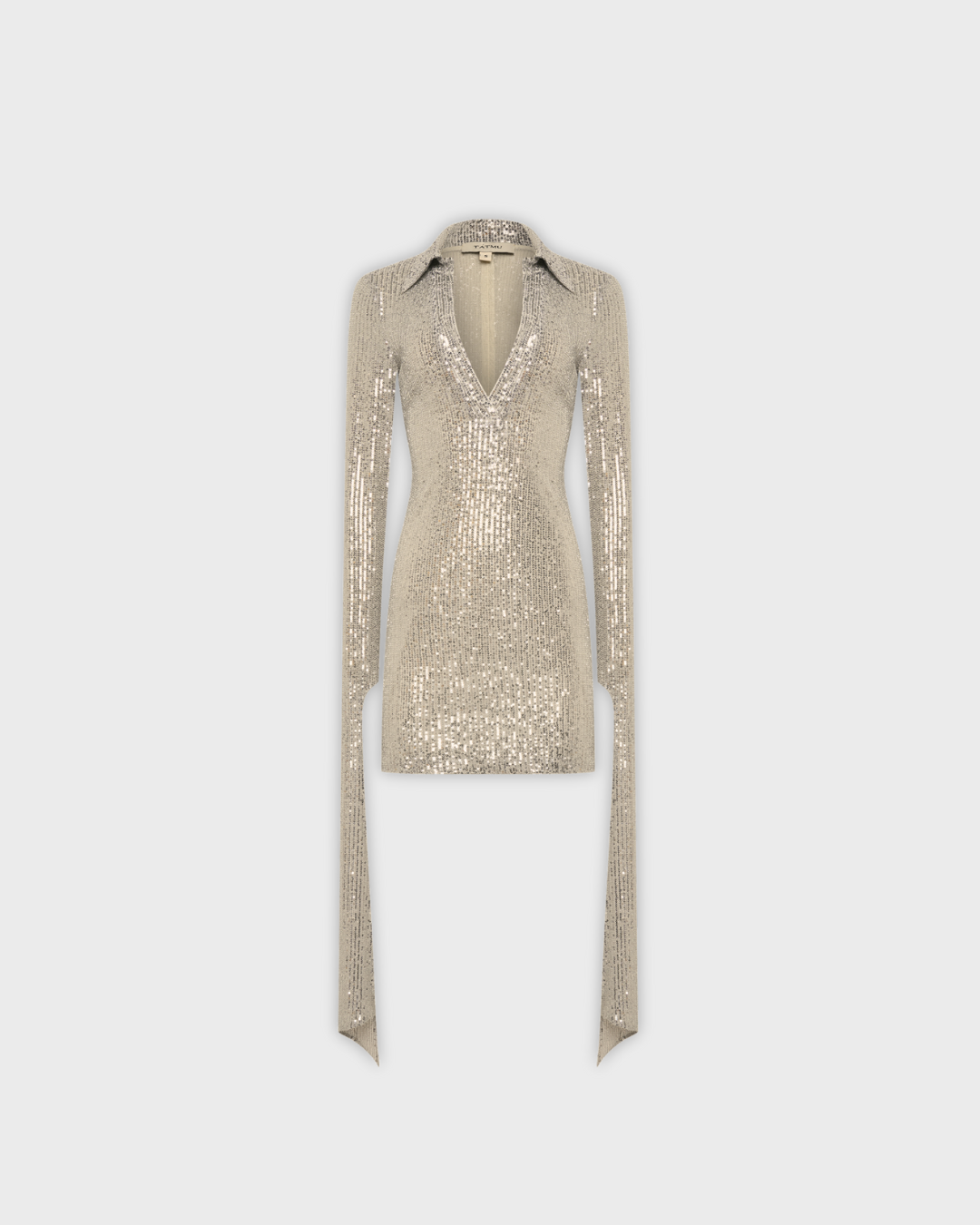 Мини-платье с длинными рукавами и глубоким вырезом.Эффектное платье, полностью расшитое пайетками, подчеркивает силуэт и создаёт ощущение мягкого сияния. Удлинённые манжеты и воротник придают модели выразительность.