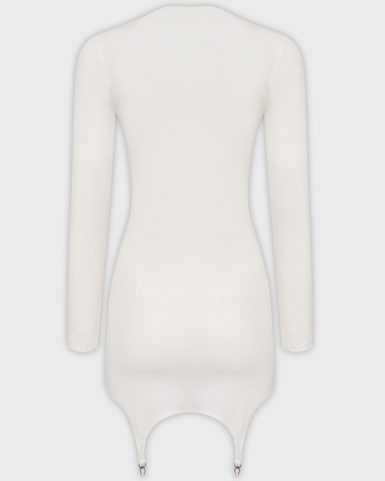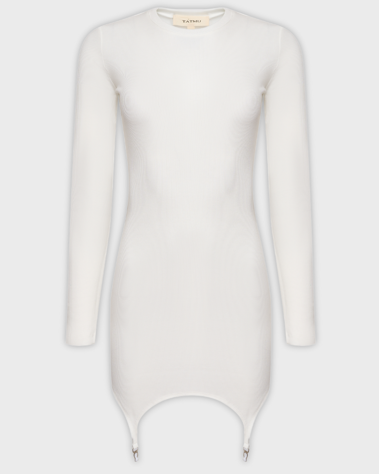 Облегающее мини-платье из хлопкового трикотажа в рубчик. Модель с длинными рукавами и закрытым верхом дополнена акцентными стрипсами — декоративными подвязками по низу. Сочетание дерзких деталей и лаконичного кроя создаёт смелый, но не вызывающий образ.
