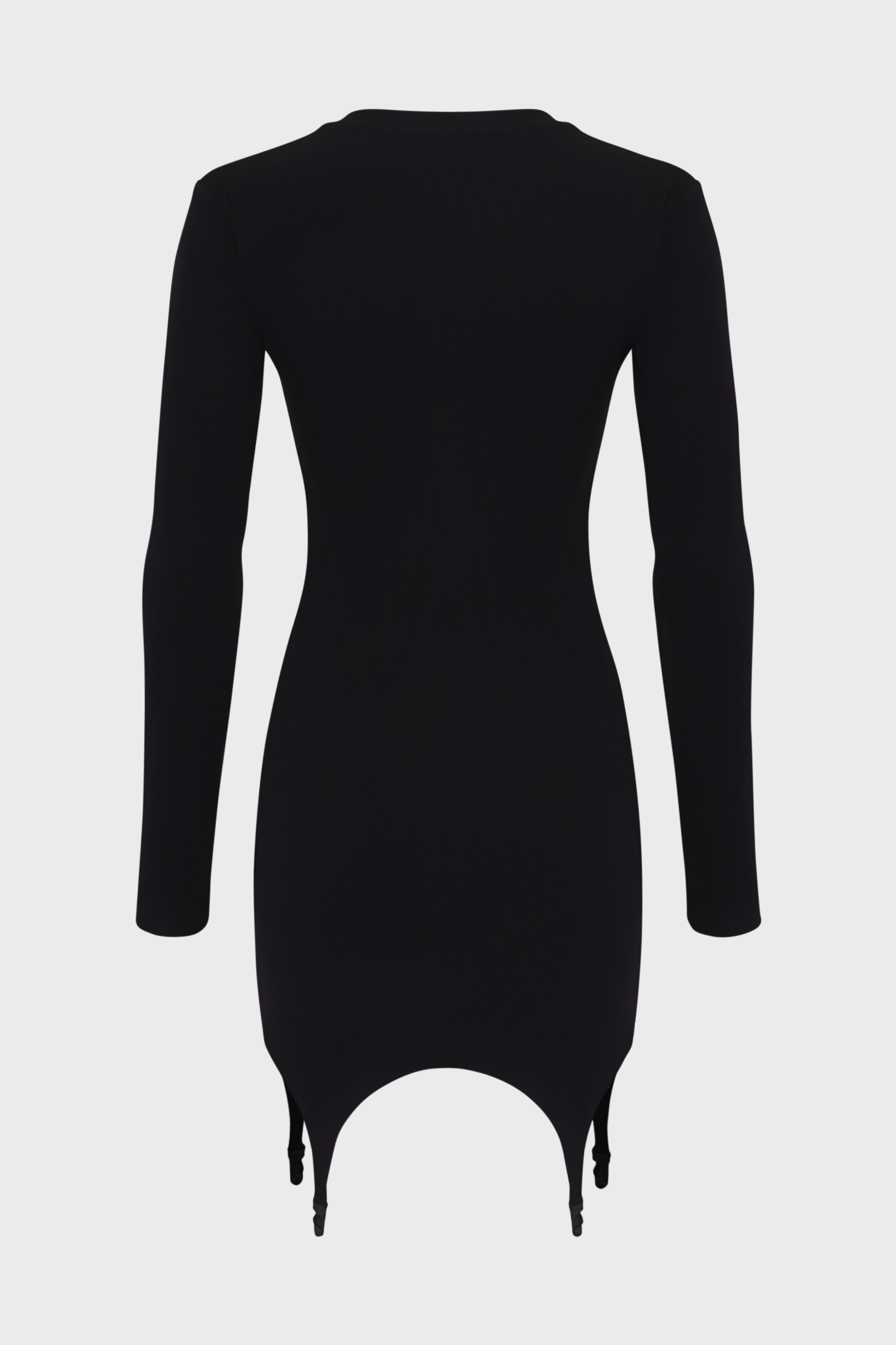 Облегающее мини-платье из хлопкового трикотажа в рубчик. Модель с длинными рукавами и закрытым верхом дополнена акцентными стрипсами — декоративными подвязками по низу. Сочетание дерзких деталей и лаконичного кроя создаёт смелый, но не вызывающий образ.