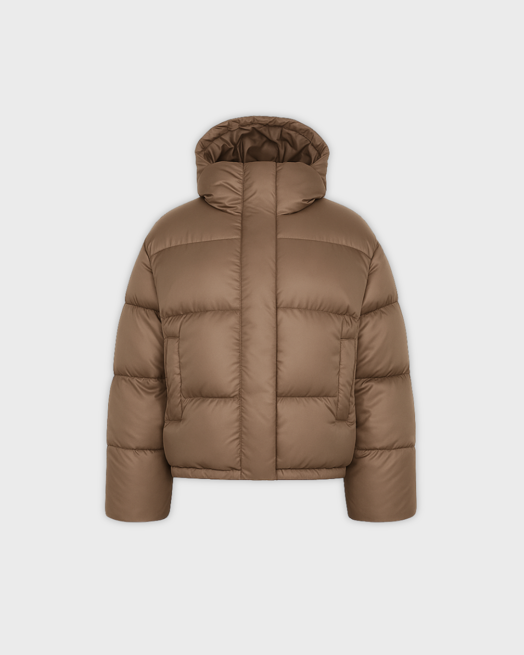 Модель прямого силуэта с объёмным воротником-капюшоном выполнена в насыщенном оттенке мокко. Лёгкий и тёплый пуховый наполнитель обеспечивает комфорт в холодное время года.