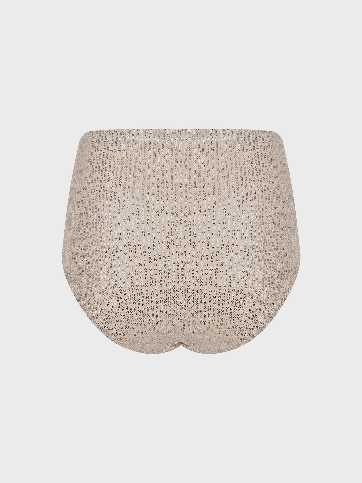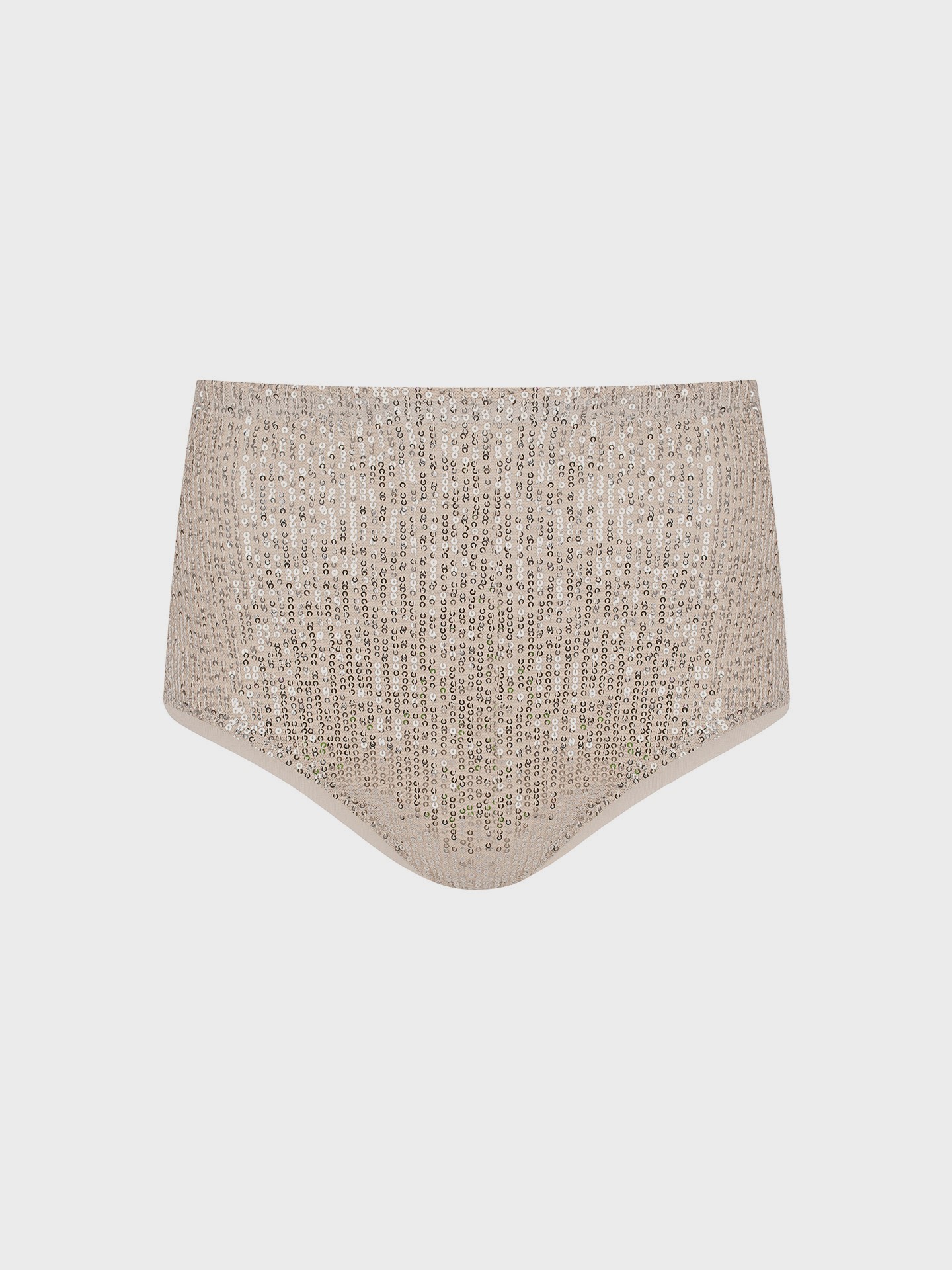 Эффектные мини шортики с высокой посадкой, выполненные из ткани, расшитой пайетками. Эластичная основа обеспечивает комфортную посадку, а блеск пайеток добавляет образу особый акцент.