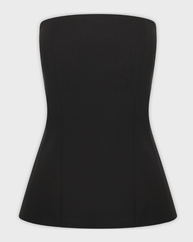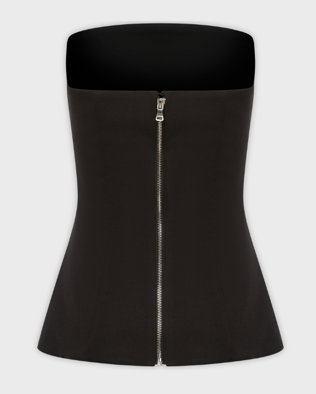 Корсетный топ приталенного силуэта выполнен из костюмной ткани с добавлением вискозы. Благодаря плотной посадке подчёркивает фигуру, визуально вытягивая силуэт. Застёжка на молнии сзади обеспечивает удобство при надевании. Лаконичный дизайн делает топ универсальной основой гардероба.